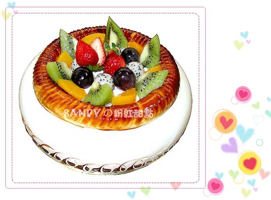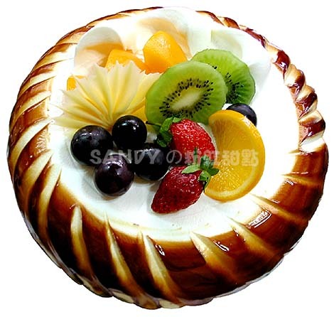 水果盆蛋糕" 很像 前面幾個步驟幾乎一模一樣...只是老師用兩種不同的手法教我們 就看哪種方法做得順手就選哪種囉~ 做法:1. 將蛋糕剪成圓弧狀抹平
